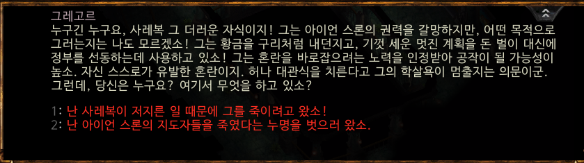 영웅의 숨겨진 진실은 악마였다 라는 설정이 비슷한 시기에 나왔던 디바인 디비니티와 유사해서 그다지 색다르지 않았고 무엇보다 끝마무리가 제대로 되지 않아 아쉬웠다 물론 이는 뒤에 확장팩으로 나왔기 때문에 EE판만의 스토리로 종결을 따지는 것은 다소 무의미하긴하다