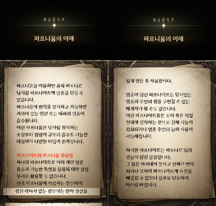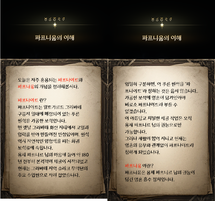 용제 파프니르가 파프니움(영혼흡수장치)을 이용하여 푸른 원석에 인간 또는 데바의 영혼을 담은 것이 바로 파프나이트 파프나이트를 신체에 착용하면 담긴 영혼의 힘을 사용할 수 있으나 대신 신체가 변이되는 부작용이 있다