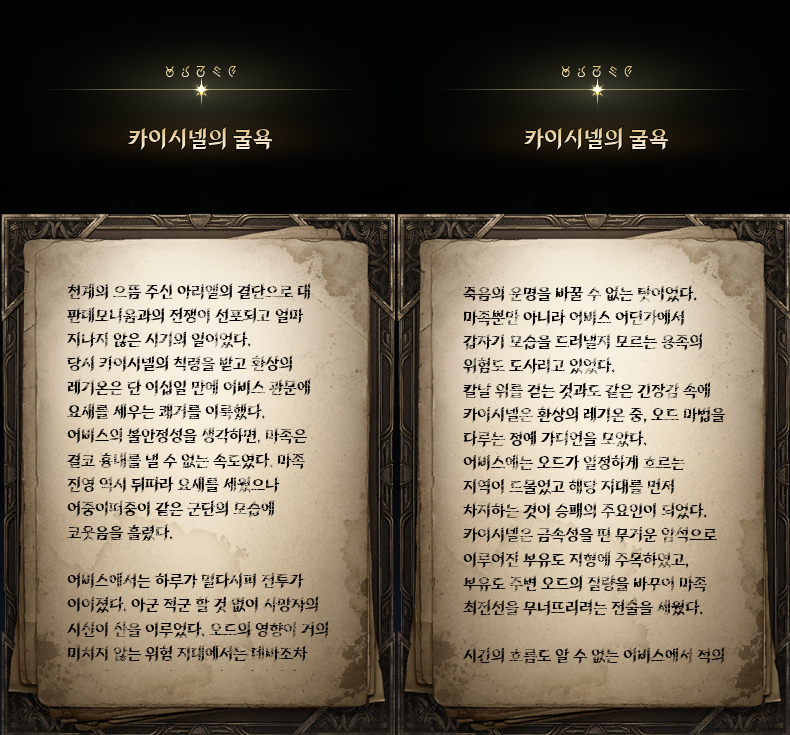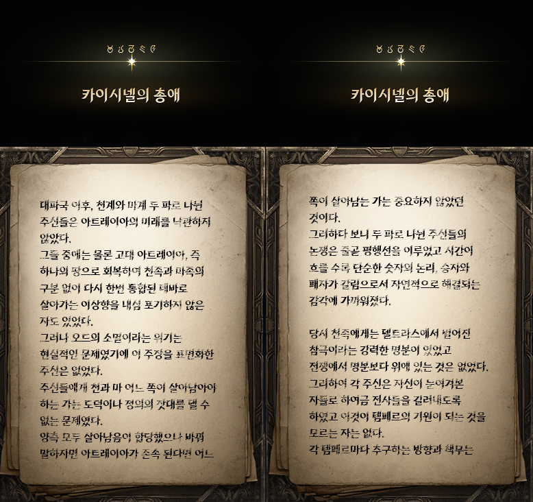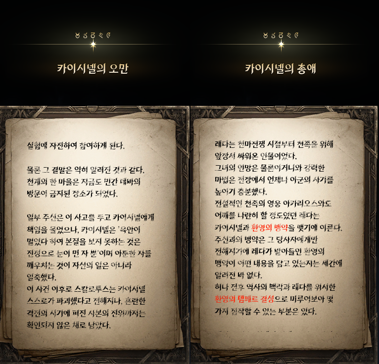 3부작을 합치면 분량이 꽤나 많기에 얻을 수 있는 정보도 많다. 카이시넬의 성격을 보여주는 일화부터 템페르의 기원, 천마가 대립하여 끊임없이 싸우게 되는 계기까지. 탐독하는 재미가 있던 서브퀘. 카이시넬과 환영의 템페르에 관한 더 깊은 이야기는 카이시넬의 그림자 1~3권에서 더 볼 수 있다.