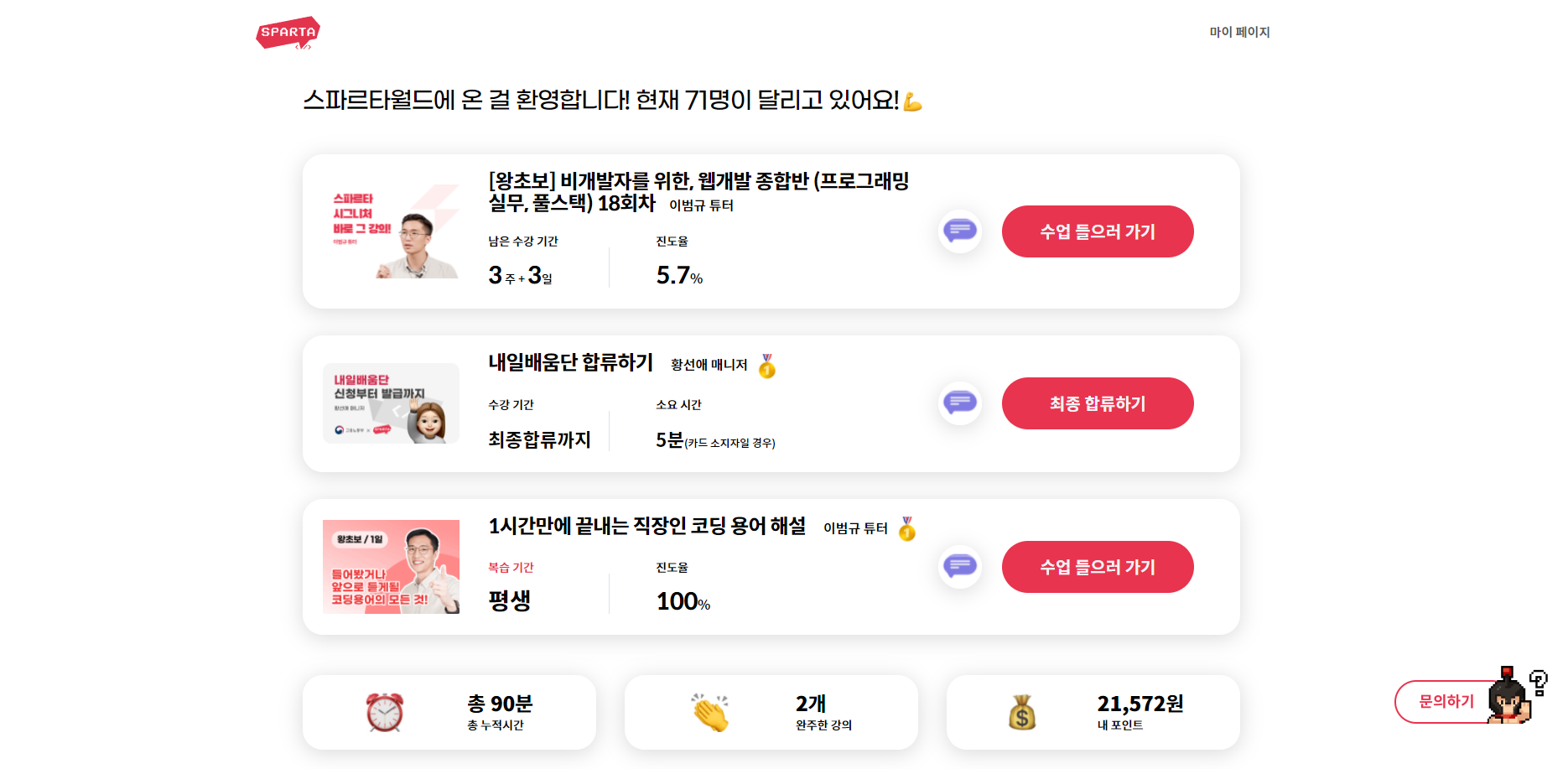 그리고 매일 강의시작 전에 같은 기수들의 진도표를 한 눈에 확인할 수 있다. 필자는 22년 02월 21일 시작이였는데 야간에 바쁘게 일하다보니 뒤늦게 시작했다. 사실 지금도 주6일 출근에 평일낮엔 학과공부, 코딩공부는 오로지 일요일 하루만 할 계획이라 다소 빠듯한 생활이 예상되지만 지금까지 허망하게 소비한 과거의 시간들과 나를 생각하면 충분한 처사다.