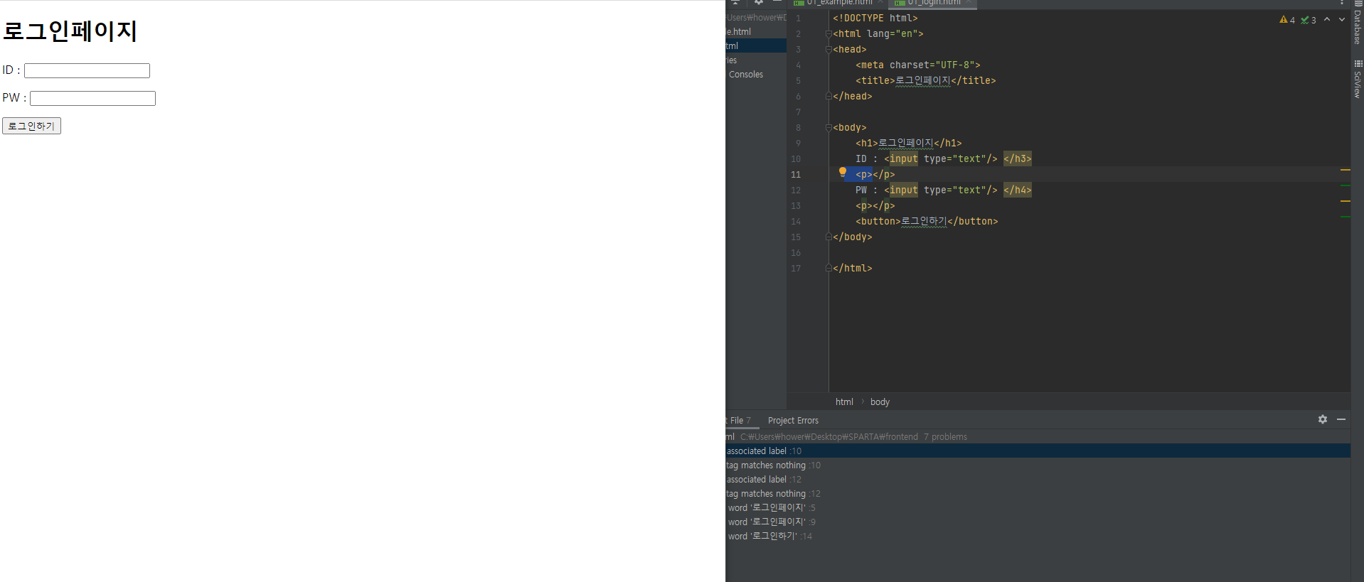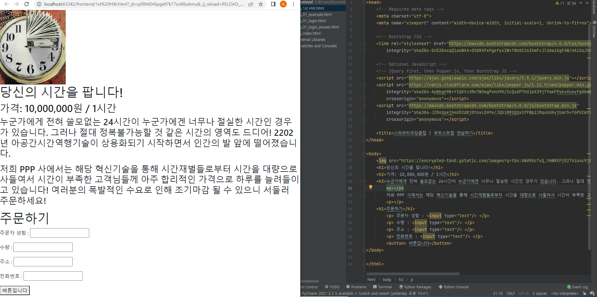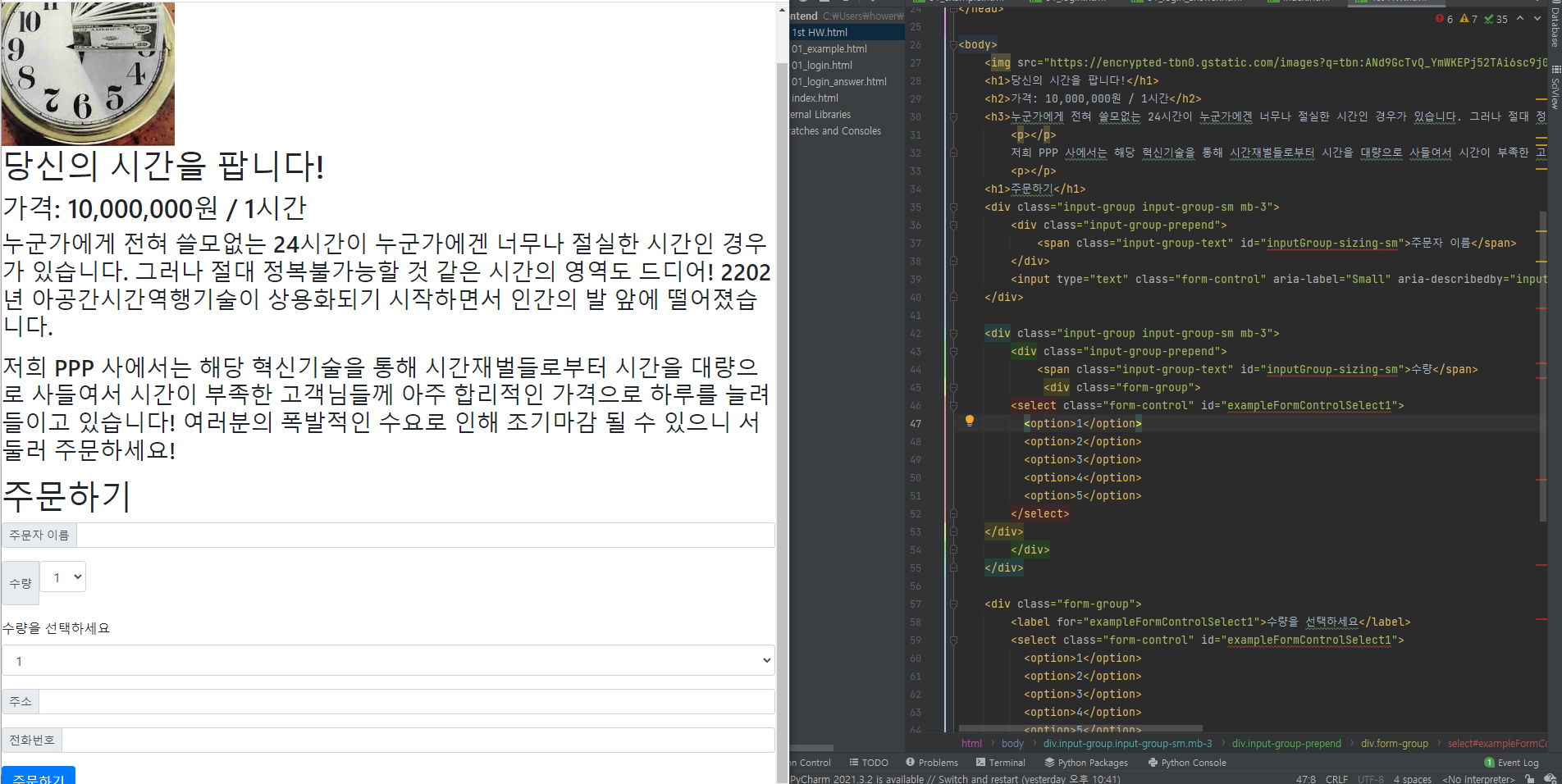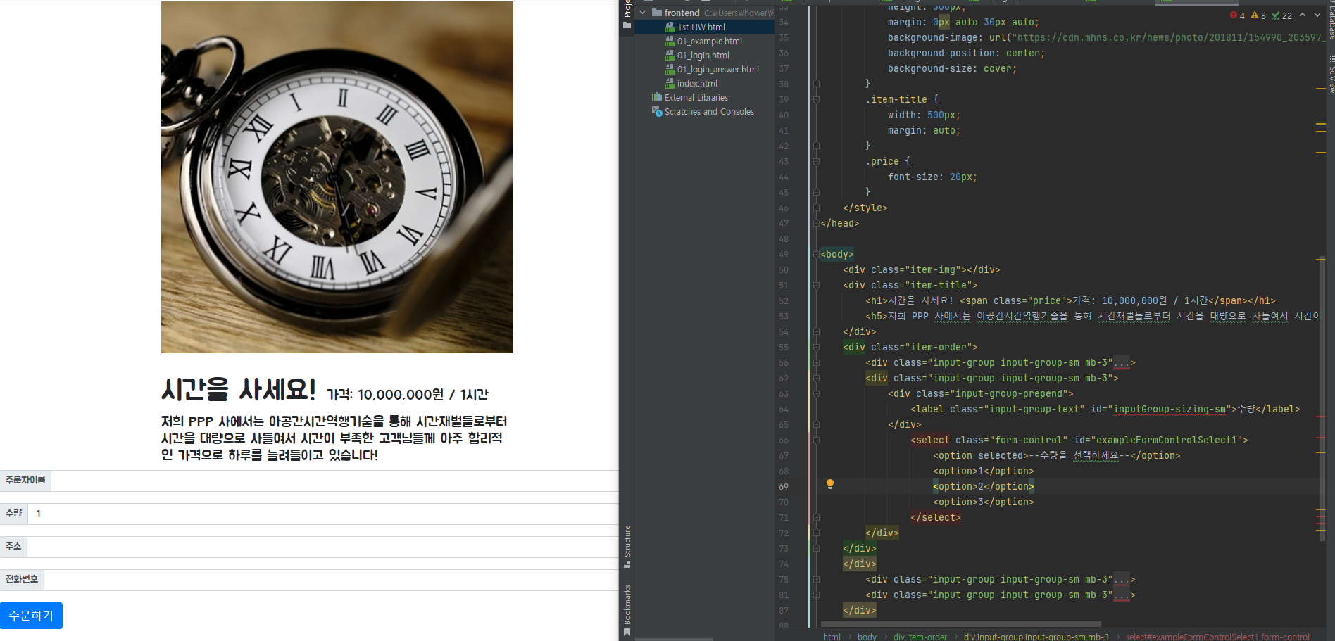 해설지를 보면서 이해하고 붙여넣기만 했을 뿐인데도 시간이 꽤나 흘렀다. 그치만 이제 어떤 식으로 코딩을 해서 프론트앤드를 하는지 조금 가늠이 잡힌다. 코딩은 대략적으로 헤드와 바디로 나뉘며 핵심적인 코딩은 전부 바디에서 이루어진다. 그 외 부수적인 코딩들, 가령 글꼴이나 크기, 색깔, 위치, 알람 등은 전부 헤드에서 이루어진다. 바디와 헤드는 떨어져있기 때문에 헤드에서 코딩할 때, 바디에서 쓰인 코드들을 다시 쓸 필요없이 class라는 명칭만 이용해서 부수적인 코딩을 한다. 쉽게 구역을 나누고 구분하여 부수적인 코딩을 하기위해서 div를 쓰기도 하고.