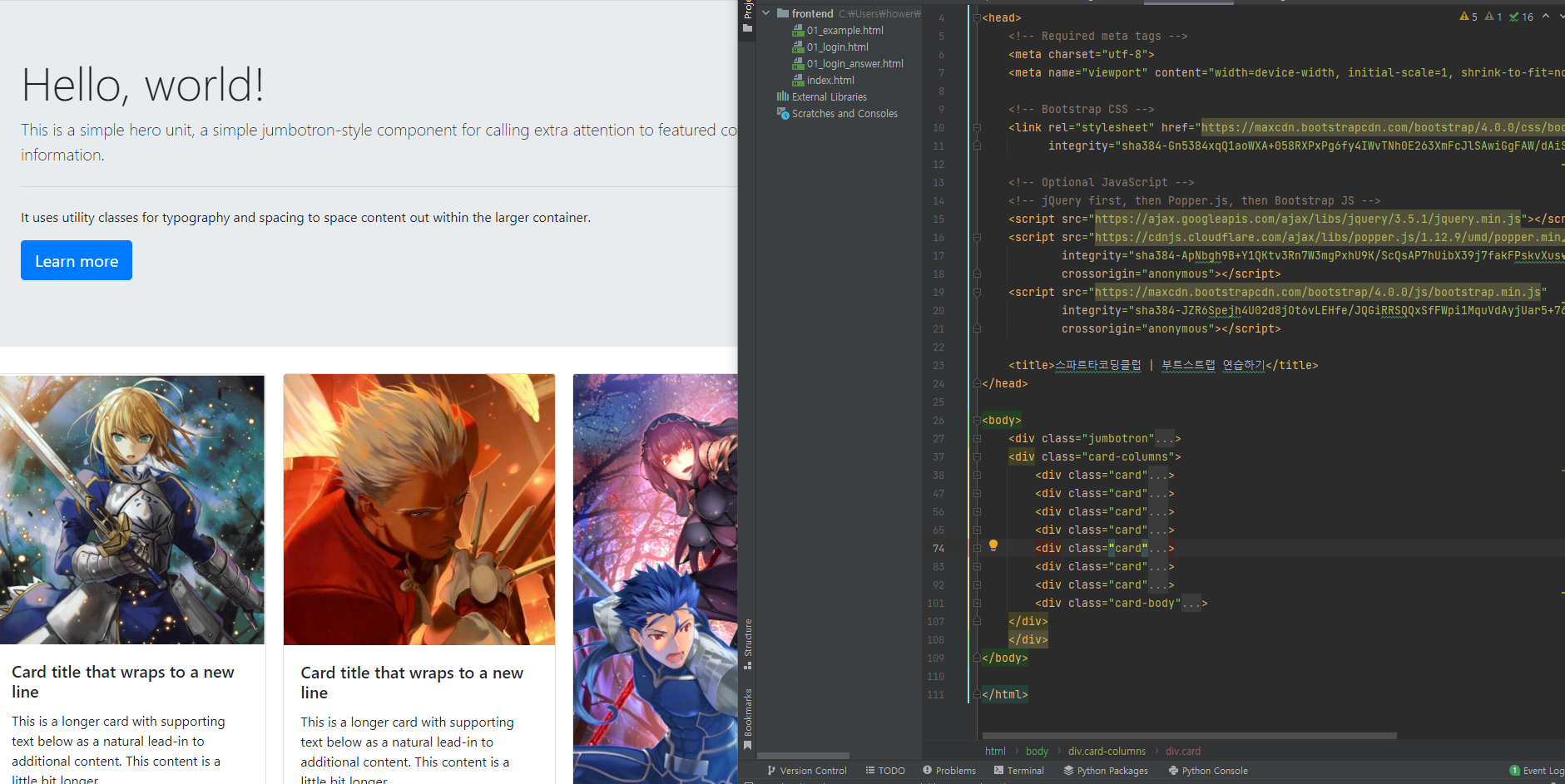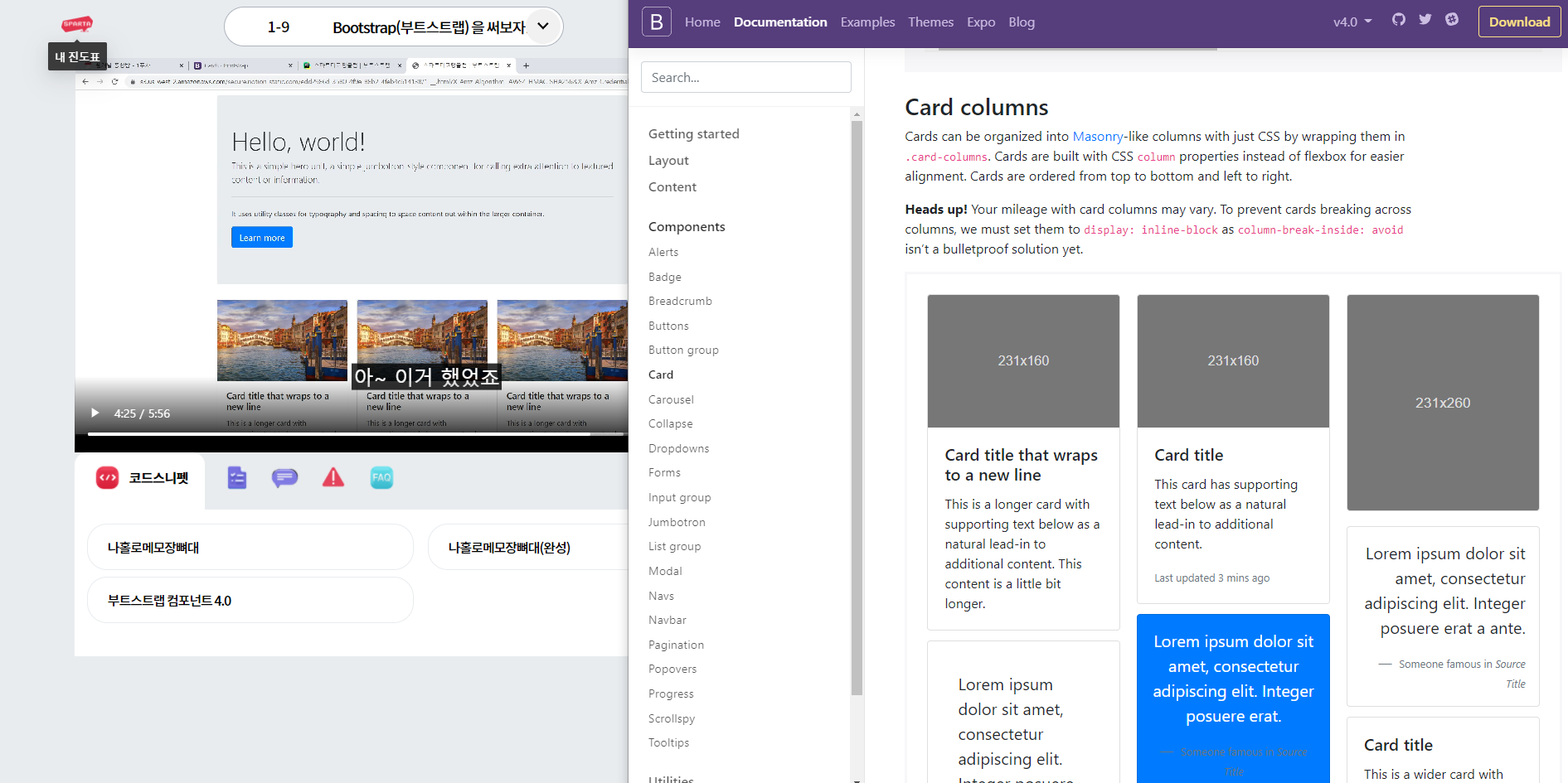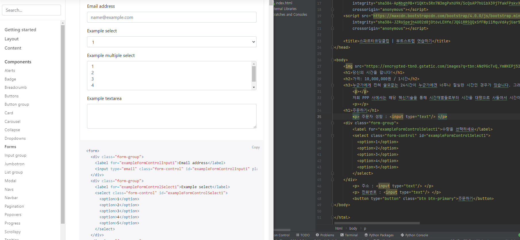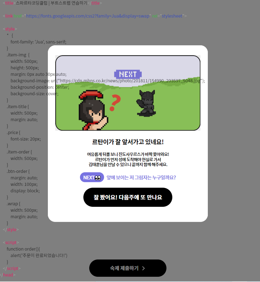 30분동안 예제와 지난실습에서 쓰인 코드들을 보면서 나름 뼈대를 완성했다고 생각했는데 예시랑 비교하니 조금 암담하다. 이번엔 1주차에서 배운 핵심인 부트스트랩에서 가져와서 살을 붙인다.