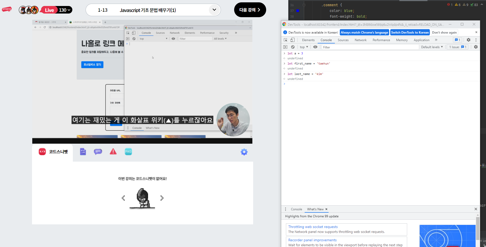 1주차동안 배운 백앤드수업이 자바스크립트 기초문법이였는데 과거에 배우던 C+과 비슷해서 이해하는데 어렵지는 않았다. 프론트앤드도 재밌지만 백앤드가 확실히 수학문제 푸는 감각같아서 더 흥미로웠다. C+, 파이썬, 자바스크립트 모두 어느정도 비슷한 뼈대를 가지면서 조금씩은 다른 점을 알아가는 재미가 있었다.