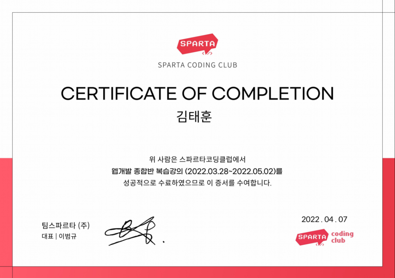 코딩을 배우고 싶다면, 여전히 팀 스파르타를 추천하고 싶은 마음은 0주차 개발일지를 쓸 때나 지금이나 변함이 없다. 다만, 고소득 연봉의 개발자가 혹해서 ~~강의를 들으면 여러분도 고소득 개발자가 될 수 있어요! 이런 말에 현혹되어서 시작하는 사람은 다시금 생각하길 바란다. 회사에서는 급조된 개발자보다는 당연히 나름 검증된 전공자를 쓰는 게 합리적인 선택이고, 전공자와 비전공자의 차이는 줄어들기 어려울 것이다. 물론 비전공자가 더 노력하면 되겠지만, 전공자들의 4년학습을 뛰어넘는 6개월이나 1년학습이 과연 가능할까? 그리고 대기업에 붙는 전공자들도 당연히 노력할테고. 이런 광고에 혹해서 시작했던 자신의 탐욕을 반성하며 이만 5주차 개발일지를 마친다.