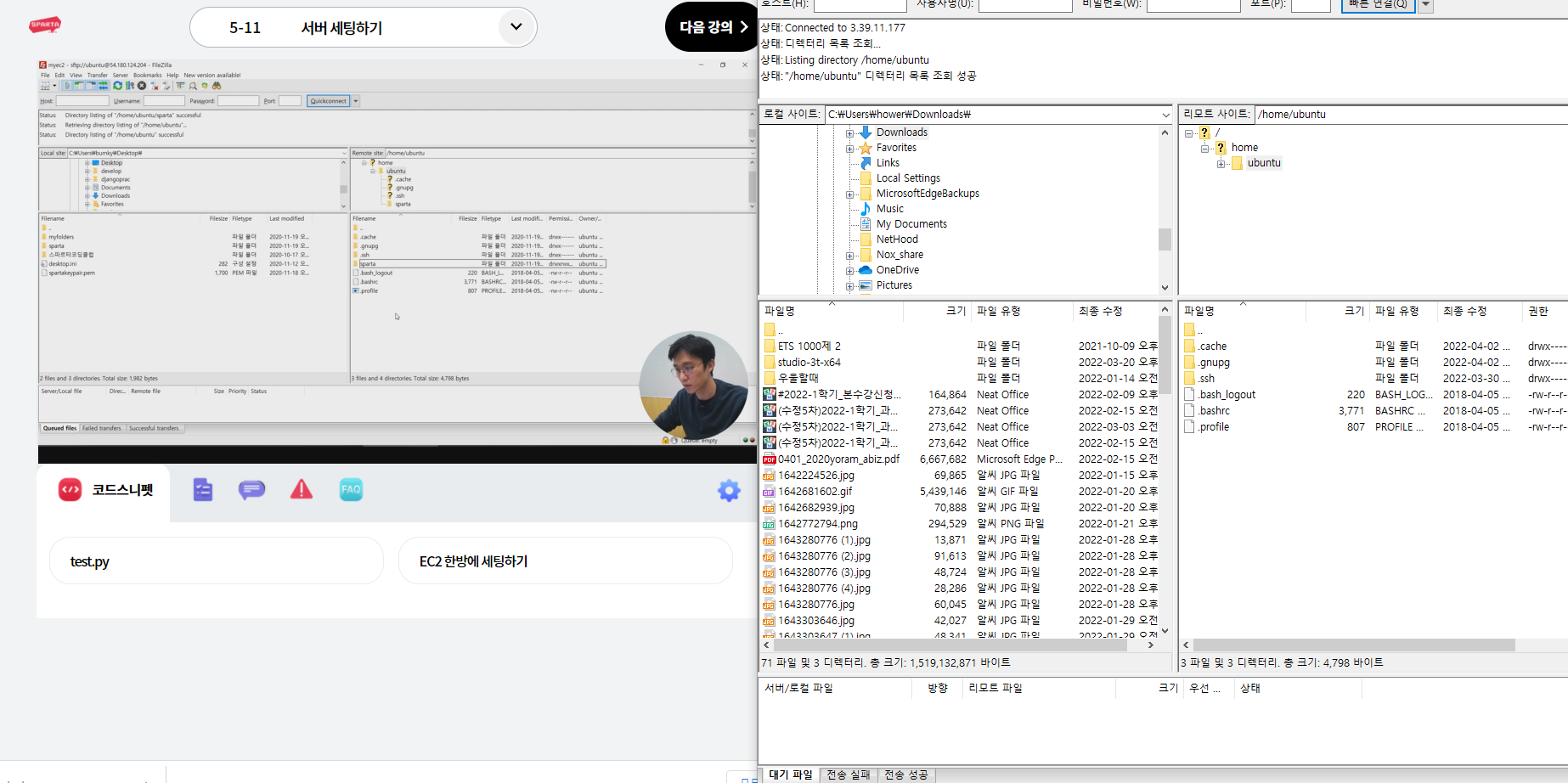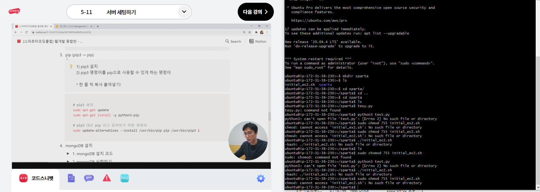 마지막 5주차에 도착했다. 5주차는 전반적으로 따로 무언가를 더 배우지는 않는다. 4주차에 한 강의 더 추가하기만 될 법한 내용을 굳이 따로내어서 앞부분에 조금 공부한 것을 제외하고는 전부 서버세팅하고 서버를 운영하기 위한 프로그램을 깔고 그를 위한 전문적인 명령어를 하거나 그게 전부다.