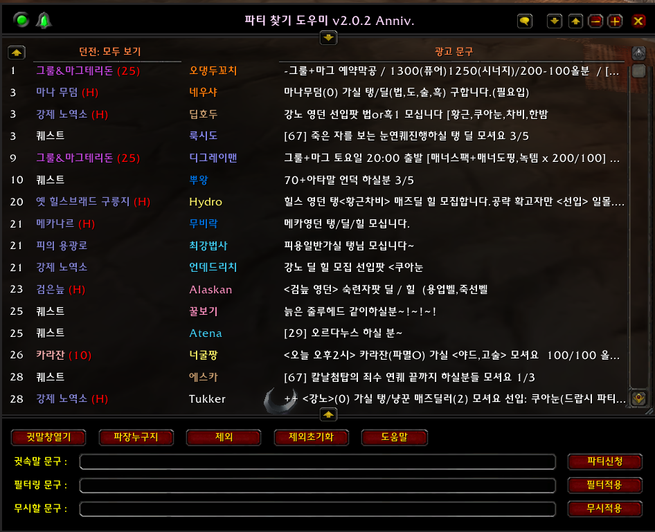 현재 와클은 파티찾기 창에서 직접 구인채팅을 올려서 파티를 꾸리는 방식인데 채팅창이 넘어가면 이를 확인하기가 쉽지 않다. 구인채팅만을 모아서 볼 수 있고, 또 원하는 던전만 체크하여 자동으로 알림을 받을 수도 있다. 파티찾기 창을 계속 들여다 볼 수고를 덜어주는 애드온