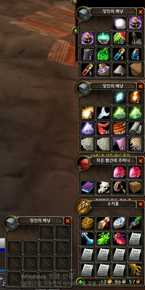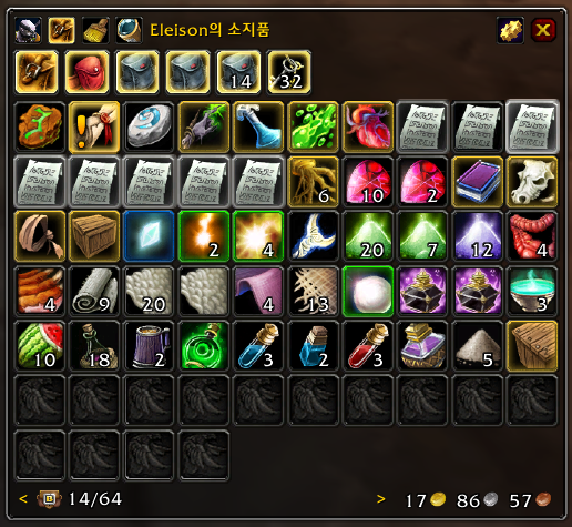 왼쪽이 기본UI 가방이고 오른쪽이 애드온UI다. 한꺼번에 모아주고 정리기능을 제공한다. 가방애드온은 여러가지가 있지만 가장 심플하고 오래된 Bagnon을 추천하는 편