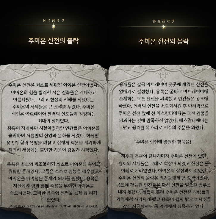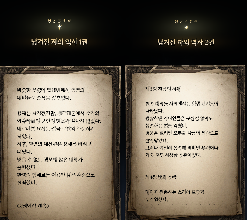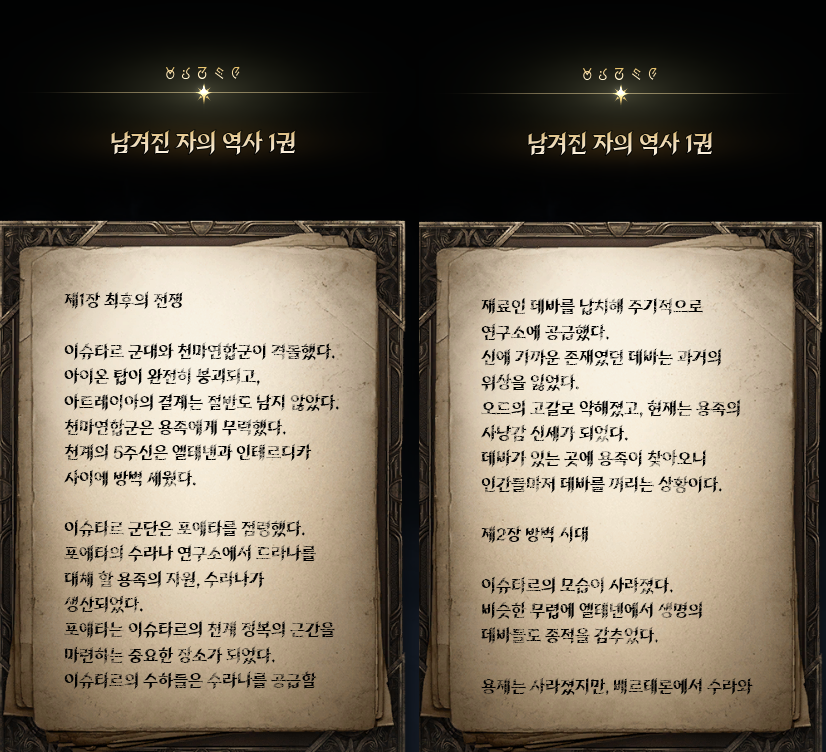천마족의 이야기가 모두 끝났다. 최고의 스토리, 박진감 넘치는 전개 뭐 이런 것은 아니지만 그렇다고 해서 무조건 스킵해야될 이야기, 읽는 시간이 아까운 수준 이런 것도 전혀 아니다. 천마족의 대립이던 아이온1에서 천마족의 협력으로 용족과 싸우는 아이온2로 달라졌기 때문에 스토리를 꼭 읽어봐야 이러한 변화를 이해할 수 있게 된다. 그래서 나름 신경을 많이 썼고 그 결과 사람들이 부캐로 키우면서 천천히 읽어볼만 하지 않을까 생각한다. 전형적인 왕도물전개지만 그렇기에 읽는 사람에 한정하여 무난한 스토리로써 아이온의 설정과 변화를 잘 풀었다고 본다. 앞으로 아이온2가 업데이트하면서 새로운 이야기가 나온다면 이야기를 먹는 정도는 할 수 있지 않을까 -25.12.05