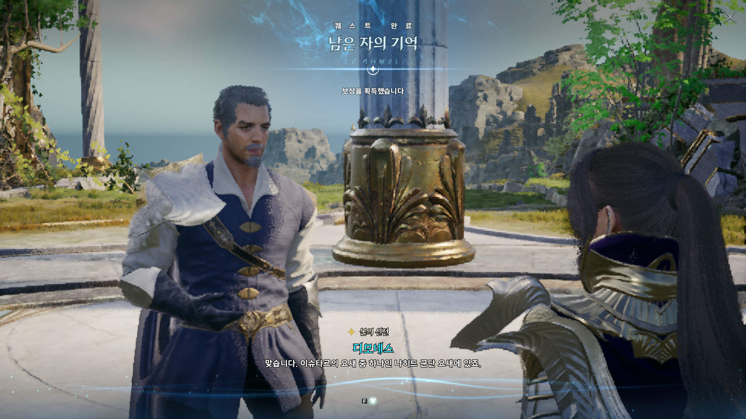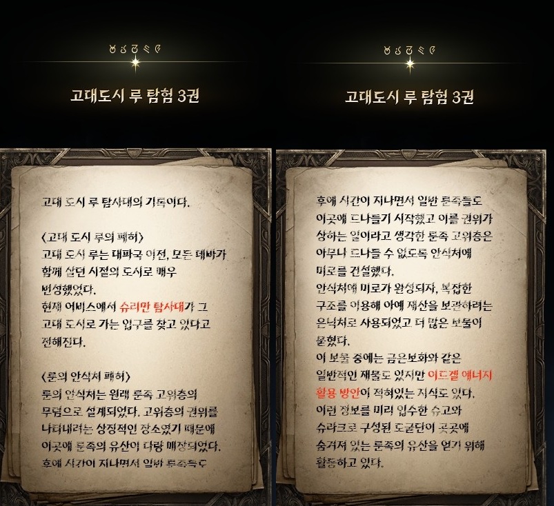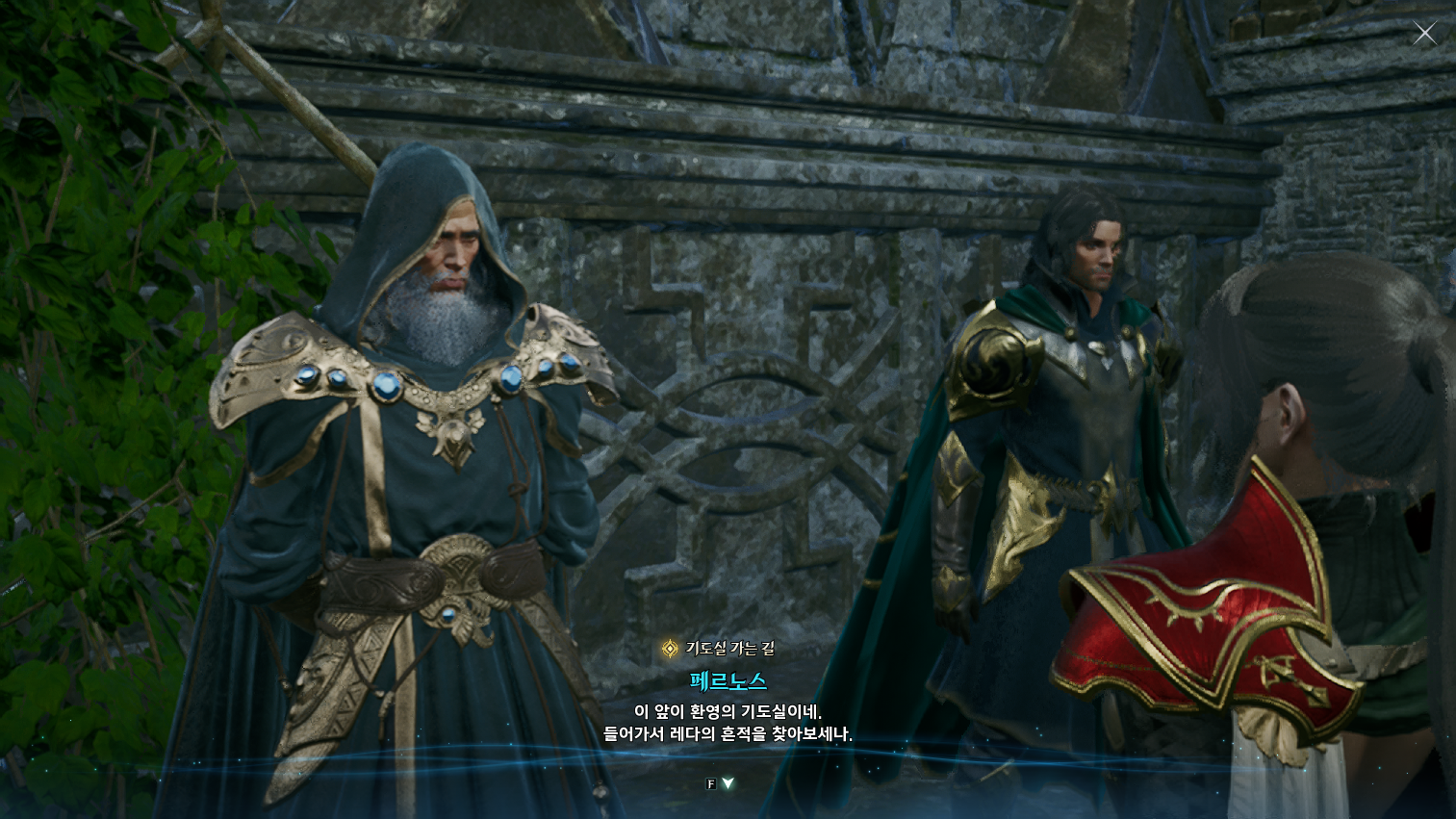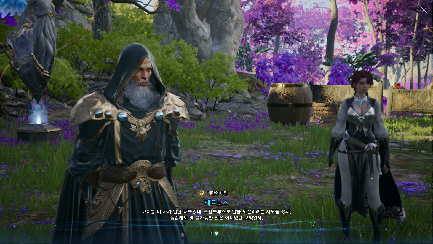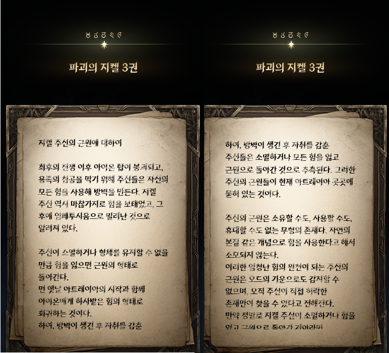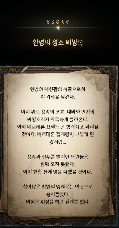 금지된 마법은 다름 아닌 사자부활술이였다. 3장에서 페르노스가 시간마법으로 과거를 돌려볼 때, 레다를 탓하는 어린 여성이 나오는데 그게 환영의 템페르 단원이 아니라 딸이였나보다. 개인적으로는 대신관이니까 용족을 막기위해 위대했던 영웅데바의 시체를 되살린다던지 혹은 자신의 신체 일부에 주신의 힘을 억지로 받아내는 그런 쪽을 생각했는데, 아쉽게도 무난한 클리셰대로 가버렸다. 마족 메인퀘를 진행할 때는 슈고 관련한 퀘스트들이 옅은 웃음을 만들곤 했는데, 이상하게 천족 메인퀘를 진행할 때는 슈고나 아울라우들이 얼빵한 짓을 해도 전혀 웃음이 나오지 않았다. 너무 판깔고 '자~ 이 부분이 저희 개그입니다! 웃기죠?' 라고 하니까 되려 웃기지 않았던 것 같다. 개그코드는 살짝 아쉽다. -25.12.02
