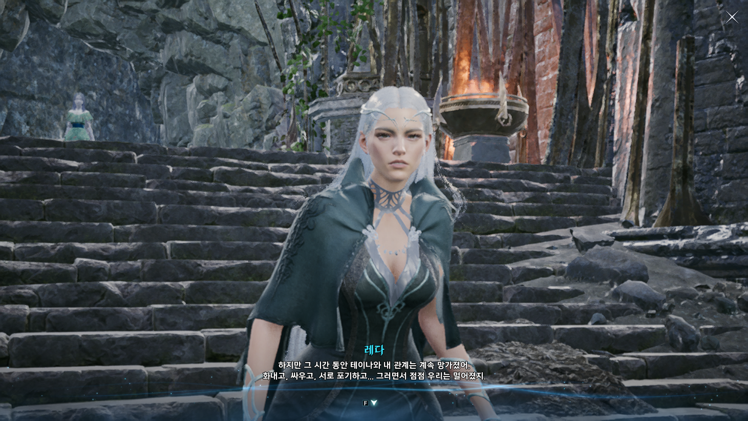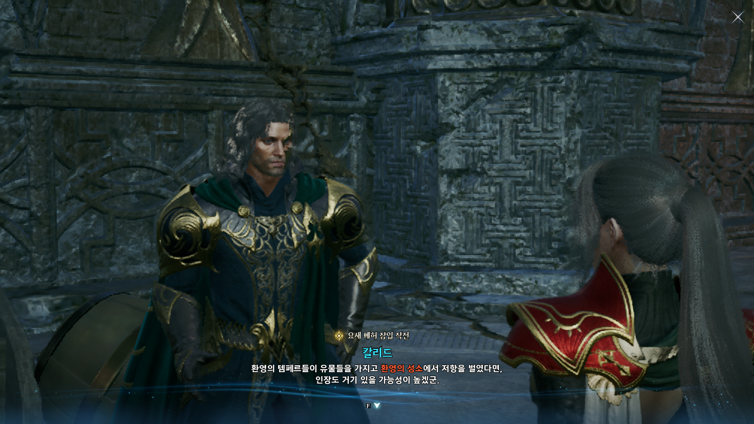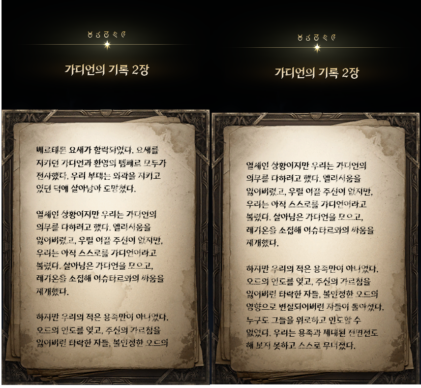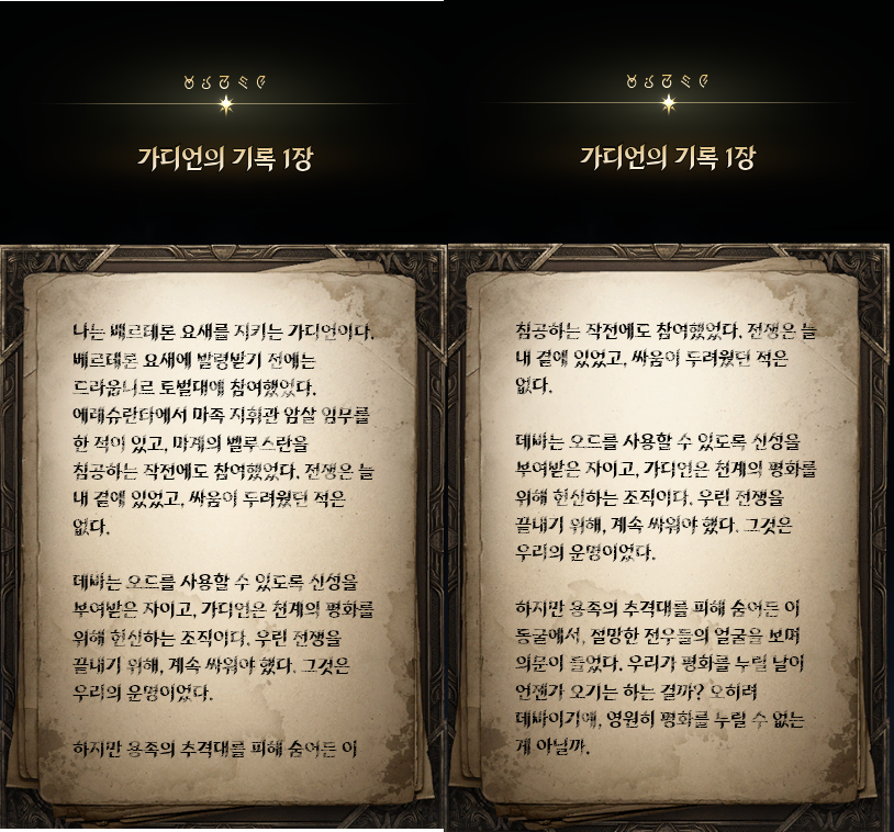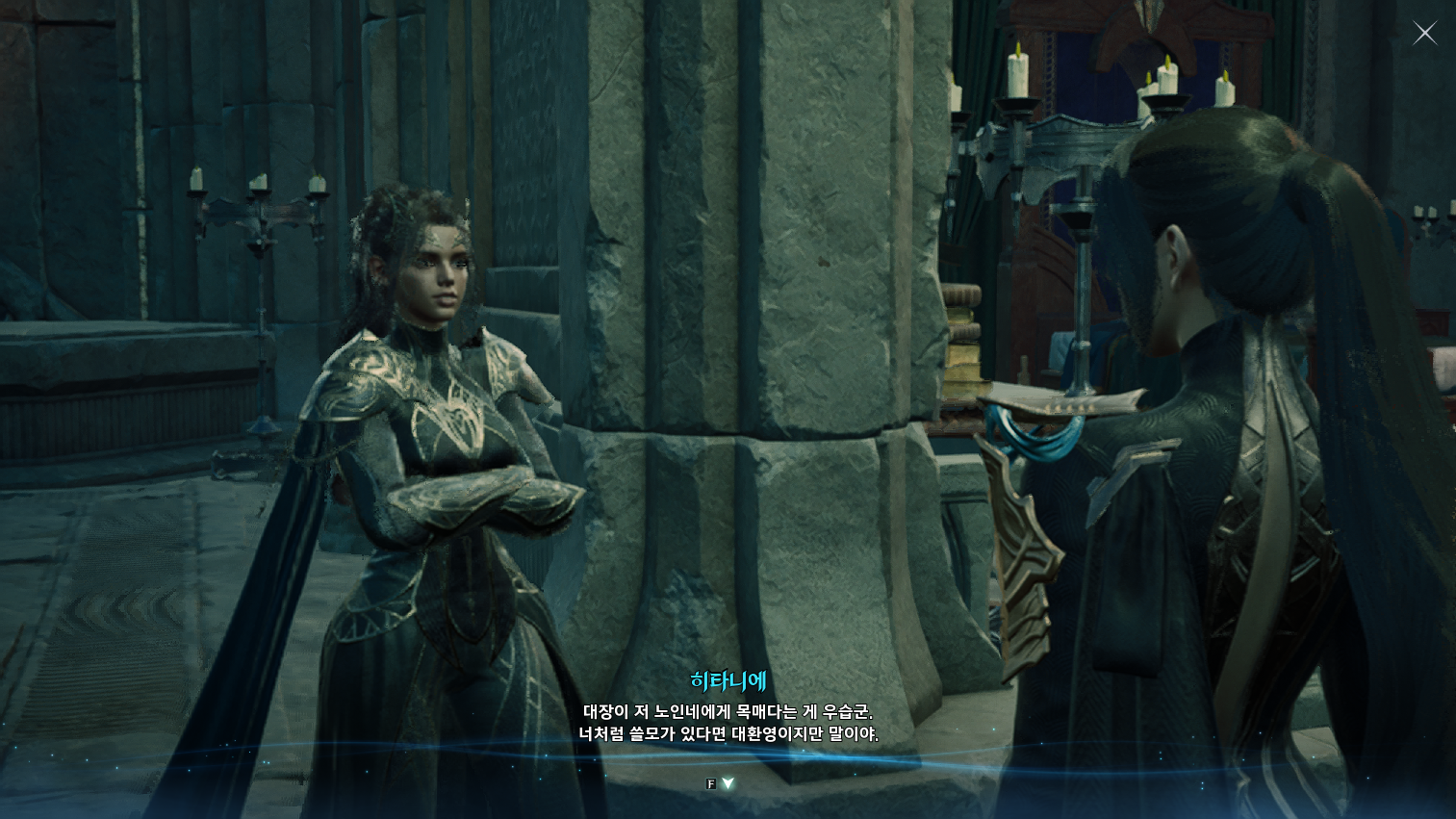금지된 마법은 다름 아닌 사자부활술이였다. 3장에서 페르노스가 시간마법으로 과거를 돌려볼 때, 레다를 탓하는 어린 여성이 나오는데 그게 환영의 템페르 단원이 아니라 딸이였나보다. 개인적으로는 대신관이니까 용족을 막기위해 위대했던 영웅데바의 시체를 되살린다던지 혹은 자신의 신체 일부에 주신의 힘을 억지로 받아내는 그런 쪽을 생각했는데, 아쉽게도 무난한 클리셰대로 가버렸다. 마족 메인퀘를 진행할 때는 슈고 관련한 퀘스트들이 옅은 웃음을 만들곤 했는데, 이상하게 천족 메인퀘를 진행할 때는 슈고나 아울라우들이 얼빵한 짓을 해도 전혀 웃음이 나오지 않았다. 너무 판깔고 '자~ 이 부분이 저희 개그입니다! 웃기죠?' 라고 하니까 되려 웃기지 않았던 것 같다. 개그코드는 살짝 아쉽다. -25.12.02