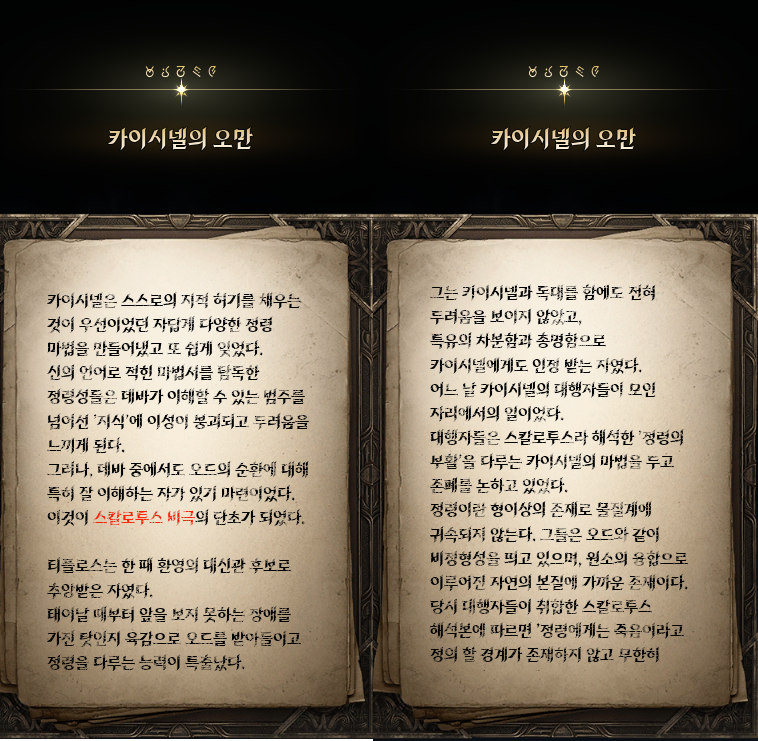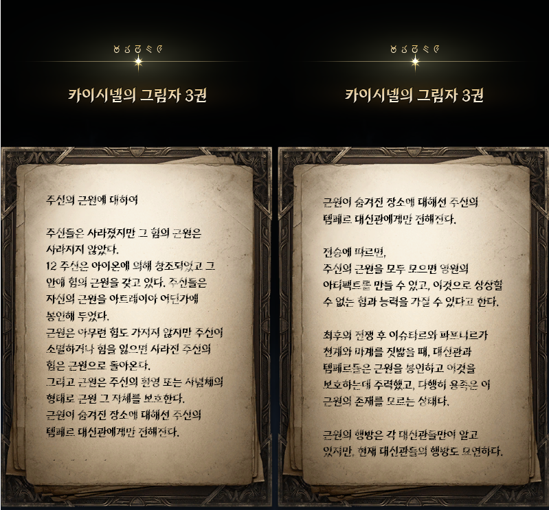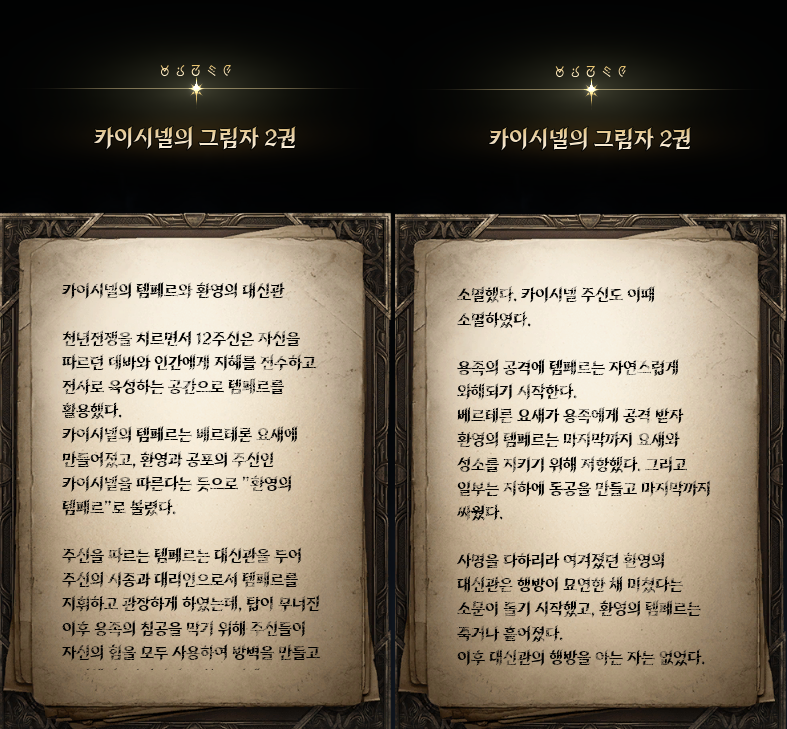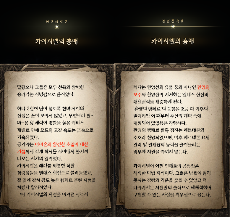 -환영의 유산 : 카이시넬의 3부작 굴욕, 오만, 총애를 구해오는 이야기 3부작을 합치면 분량이 꽤나 많기에 얻을 수 있는 정보도 많다. 카이시넬의 성격을 보여주는 일화부터 템페르의 기원, 천마가 대립하여 끊임없이 싸우게 되는 계기까지. 탐독하는 재미가 있던 서브퀘. 카이시넬과 환영의 템페르에 관한 더 깊은 이야기는 카이시넬의 그림자 1~3권에서 더 볼 수 있다.