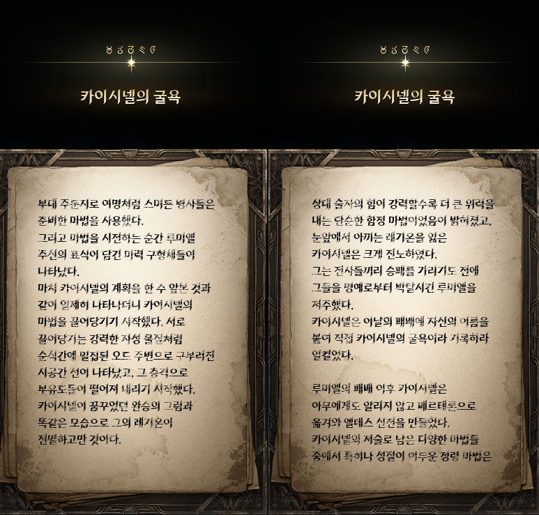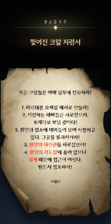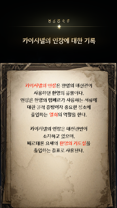 환영마법을 통해 크랄들의 눈을 피해 얻은 단서는 환영의 기도실에 출입하려면 카이시넬의 인장이 필요하다는 것과 인장은 환영의 성소에 있을 확률이 높다는 것