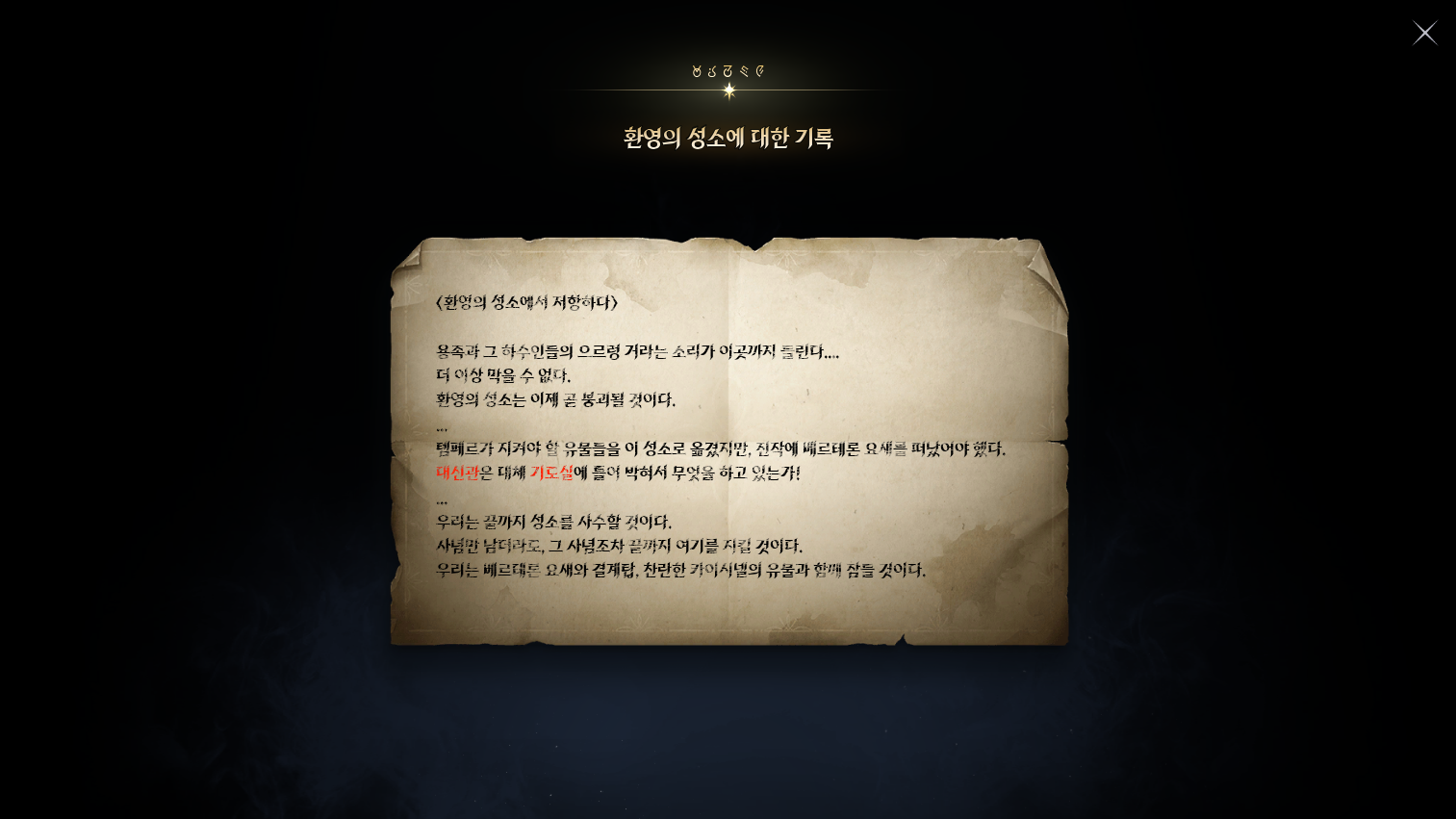 예상대로 환영의 성소에서 카이시넬의 인장을 찾은 새벽의 레기온은 환영의 기도실에 진입한다