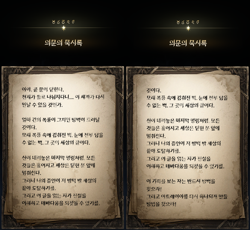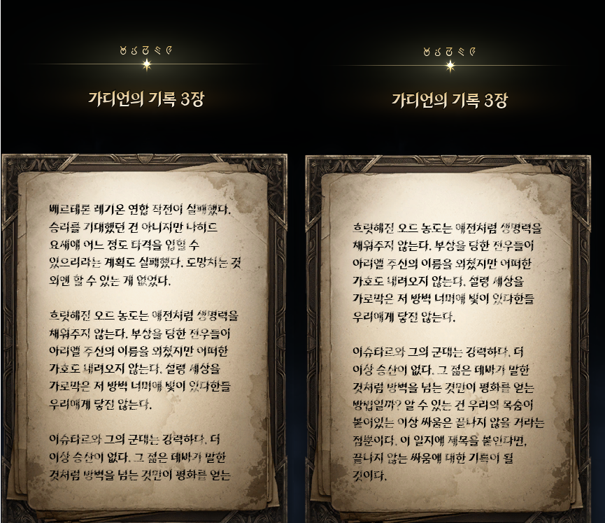 -다시 올 새벽을 기다리며 : 떠나기 전 히타니에와의 소회 히타니에는 더이상 여정에는 함께하지 않지만, 여전히 새벽의 레기온이자 최초 창단의 4인으로서 여전히 떠나는 이들을 위해 기도하고 되돌아올 곳이 되어준다는 짧은 내용. 이들의 유대감이 과하지 않게 전해져서 보기에 좋았다