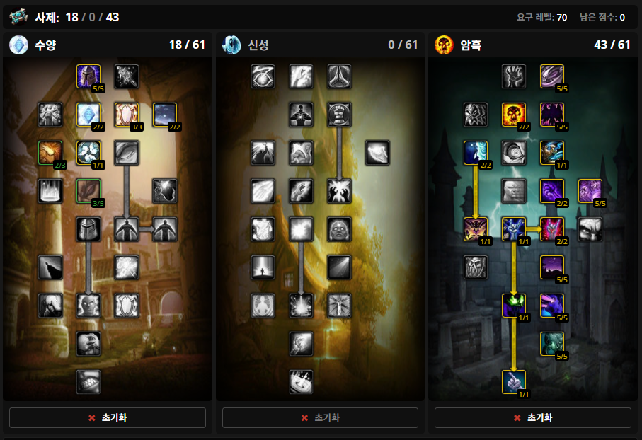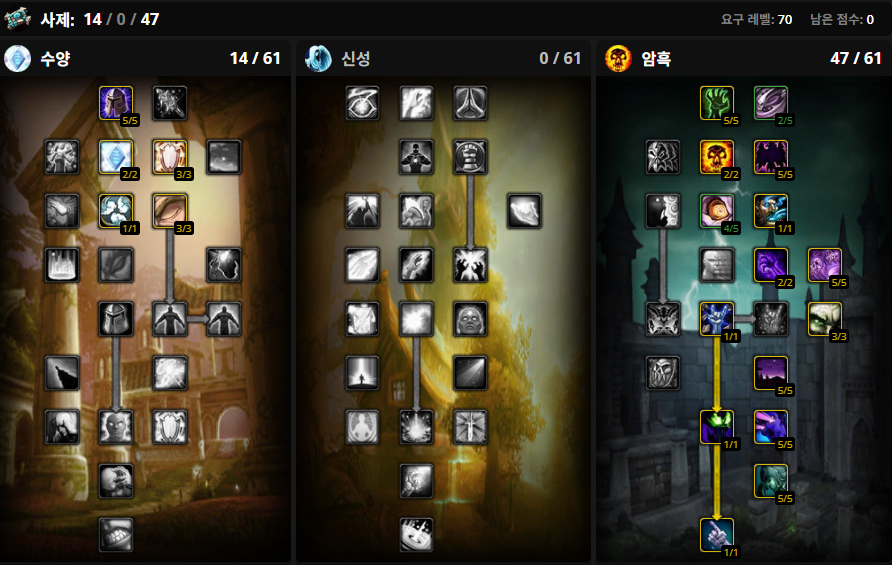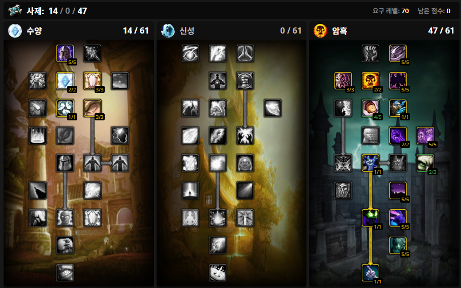 흑마와 마찬가지로 체력과 방어 그리고 순간힐에 도움되는 특성들을 찍어 PVP에서 순식간에 죽는 것을 방지하는 트리입니다
